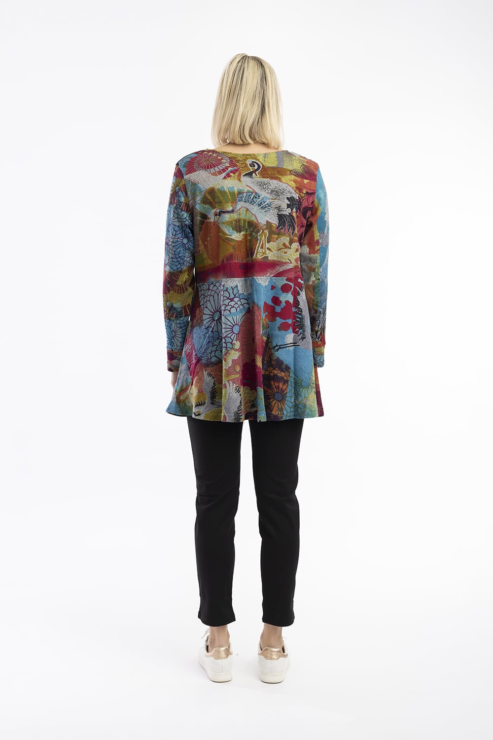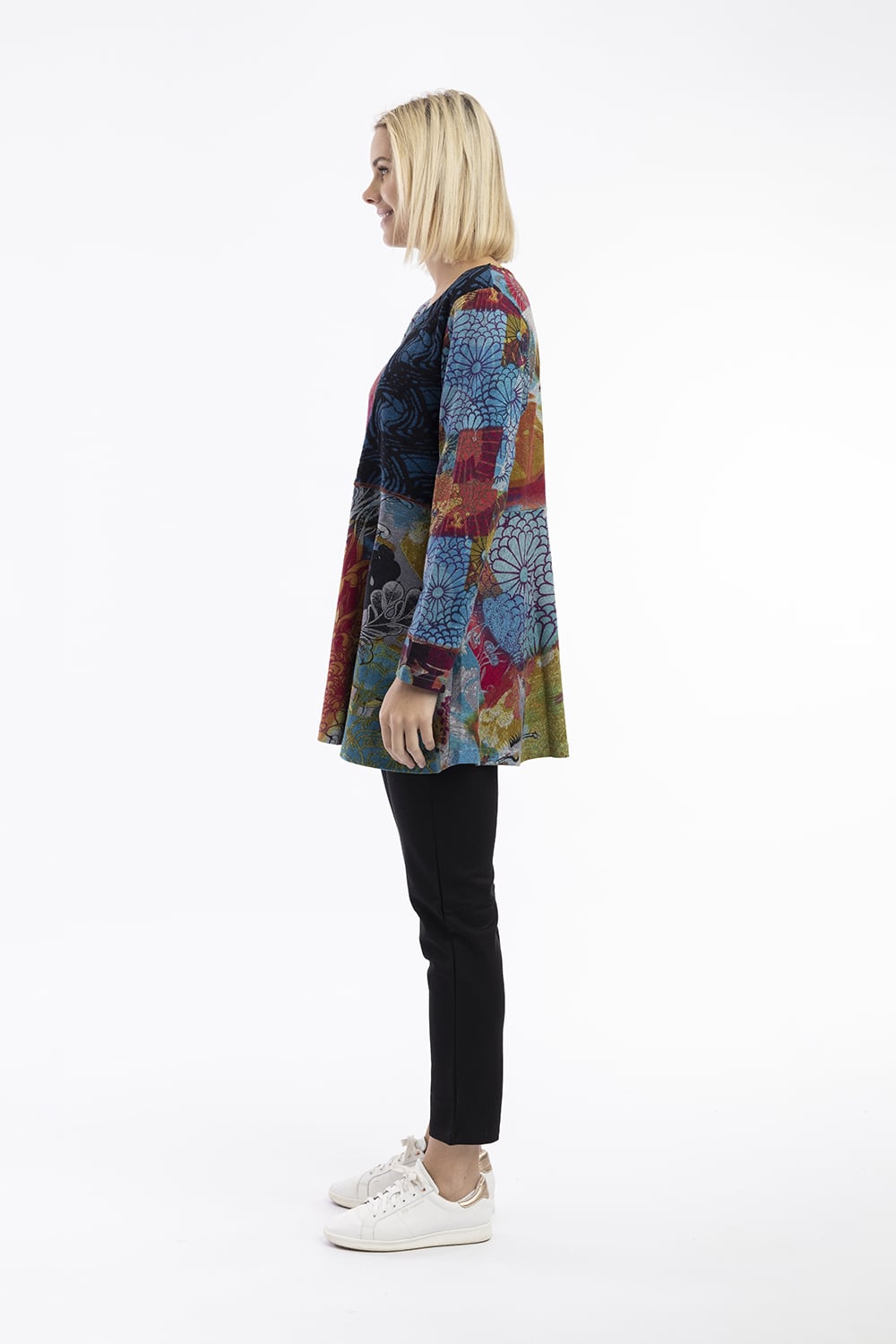The 'Billie Jean' Patch Tunic is the perfect way to infuse colour and style into a simple outfit. The fabric gracefully flares into an a-line shape, providing a flattering silhouette. With its vibrant multi-coloured abstract print hand drawn by exclusive artisans, this tunic brings a lively touch to your winter wardrobe.