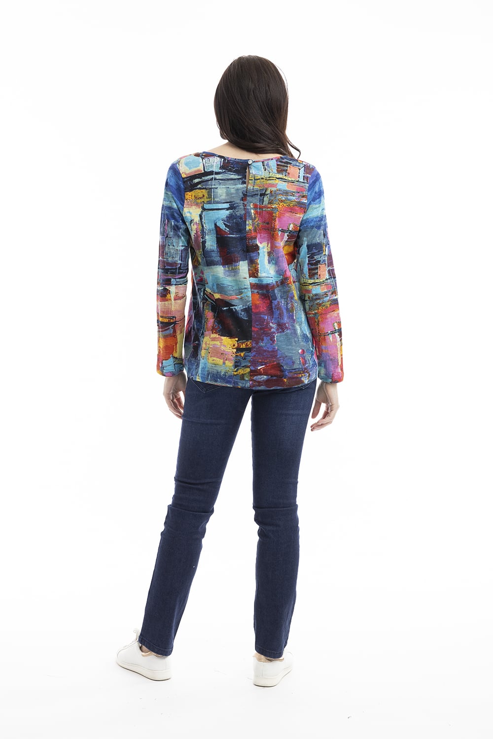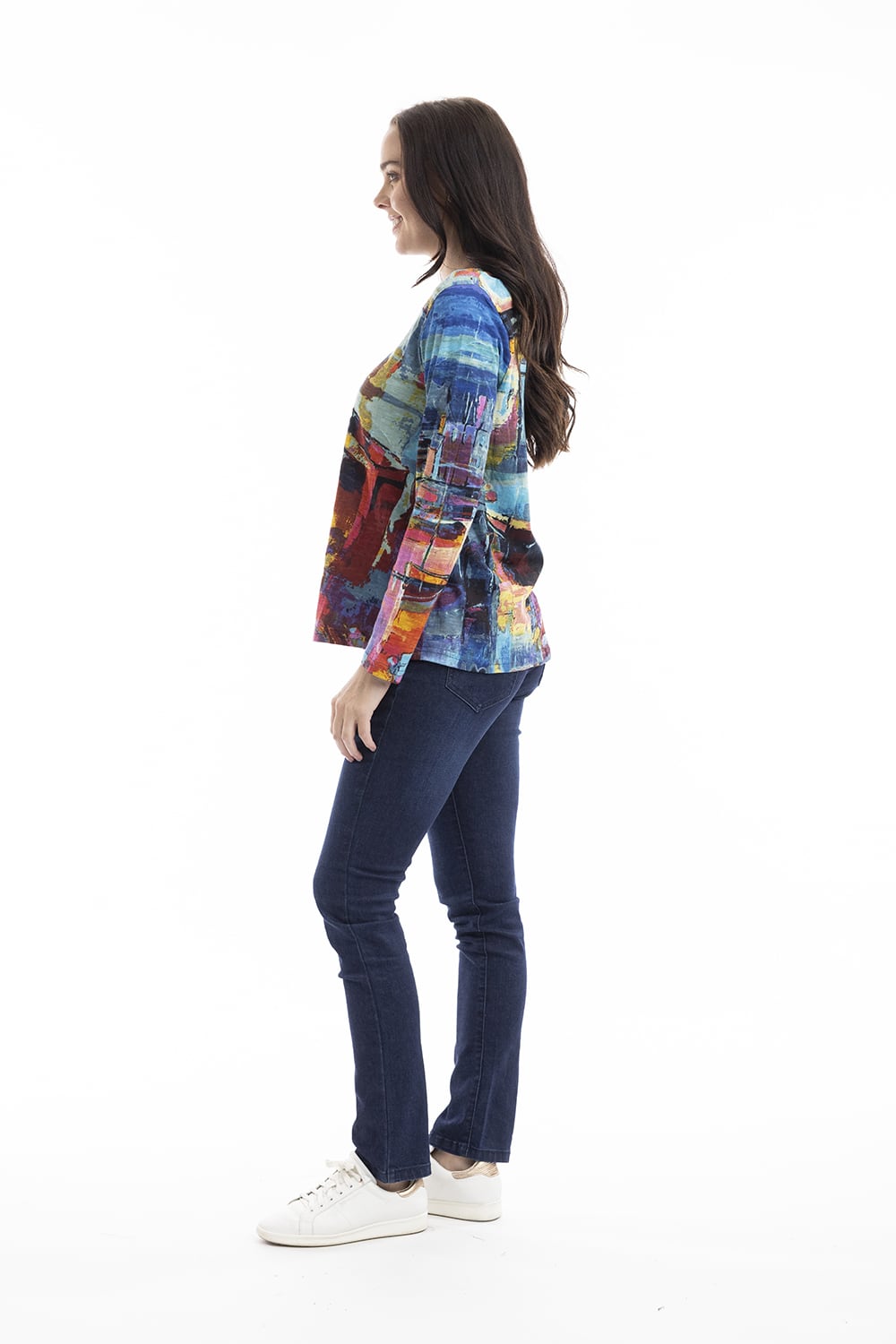 Brighten your everyday wardrobe with our contemporary t-shirt. Crafted from 100% Certified Organic Cotton, this t-shirt features a flattering V-neck, bold colours and a beautiful print. This t-shirt is perfect for elevating any basic outfit this winter!